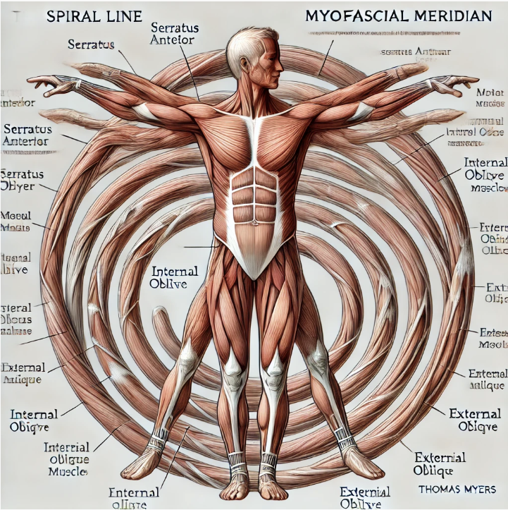 근막경선(Myofascial Meridian) 이론에서 나선선(Spiral Line)은 신체의 균형과 움직임을 조절하는 중요한 요소 중 하나입니다. 특히 신경계와의 밀접한 관계를 통해 신체의 정렬을 유지하고, 회전 및 균형 유지 기능을 향상시키는 역할을 합니다. 나선선이 제대로 기능하지 않으면 신경 신호의 전달이 저하되고, 자세 불균형 및 근육 피로를 유발할 수 있습니다.